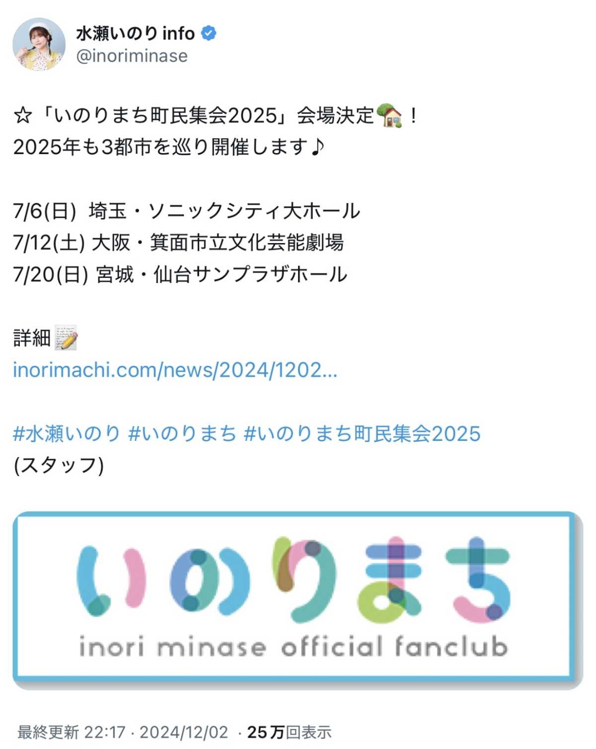 水瀬いのりさんも大阪と仙台は同じ会場に今年行く模様