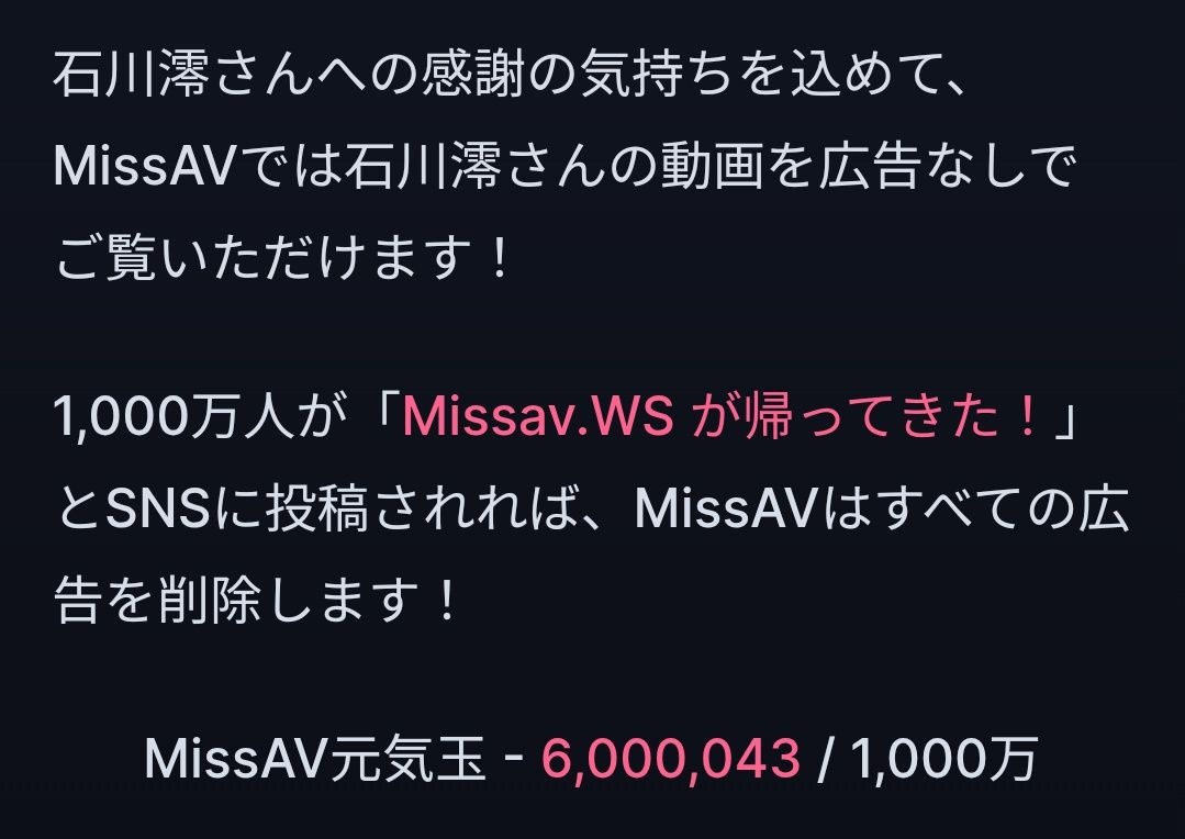 - 1,000万人が「Missav.WS が帰ってきた!」とSNSに投稿されれば、MissAVはすべての広告を削除します!