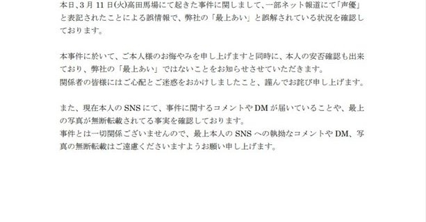 【声優】「最上あい」さん、事務所が殺傷事件巡りコメント「一切関係ない」 写真の無断転載やめるよう呼び掛け 被害者とされる配信者と”同姓同名”