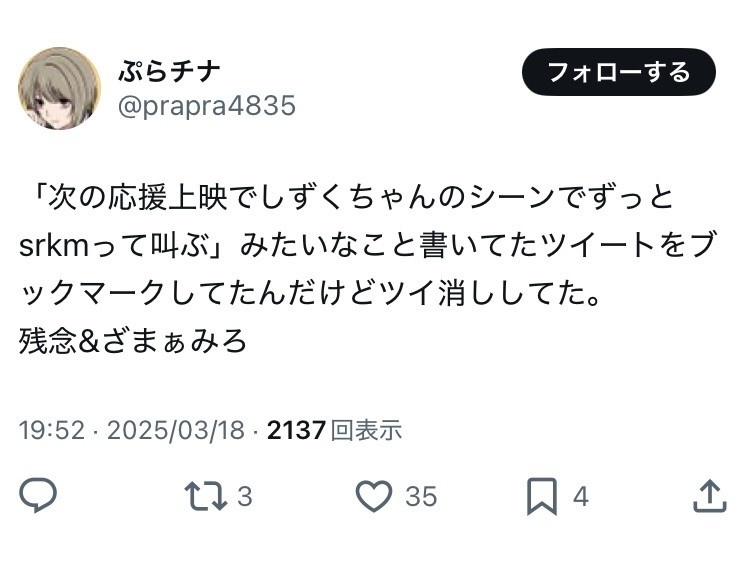 誕生日記念以外の普通の応援上映では孔雀見たことなかったんやけどな - 54 : 2025/03/19(水) 11:23:46.797 ID:YfEGPtYe3