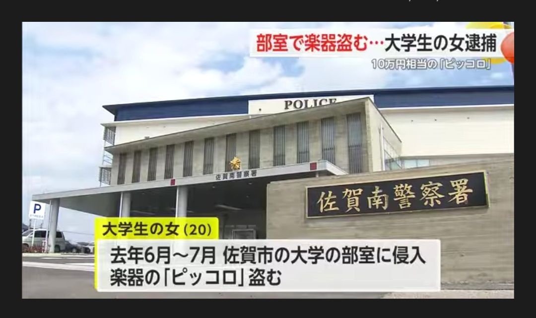 佐賀市に住む20歳の大学生の女は、去年6月から7月にかけて、佐賀市の大学の部室に侵入し、10万円相当の楽器「ピッコロ」を盗んだとして、建造物侵入や窃盗の疑いが持たれています。