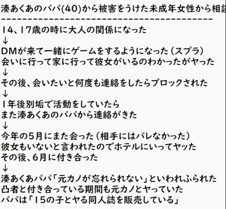 湊あくあ手掛けた人気絵師、14歳少女との淫行を暴露され謝罪 「事実です」「廃業するしかない」 - YouTubeニュース | ユーチュラ6月29日、「コレコレ」(登録者数234万人)がKickで生配信を実施。VTuber「湊あくあ」(同225万人)らを手掛けた男性イラストレーターの未成年淫行を暴露しました。 湊あくあを手掛けた人気絵師 湊あくあは2024yutura.net - 6 : 2025/06/30 09:58:24 0T3gF