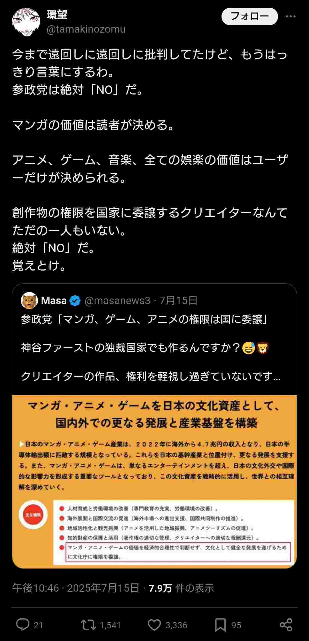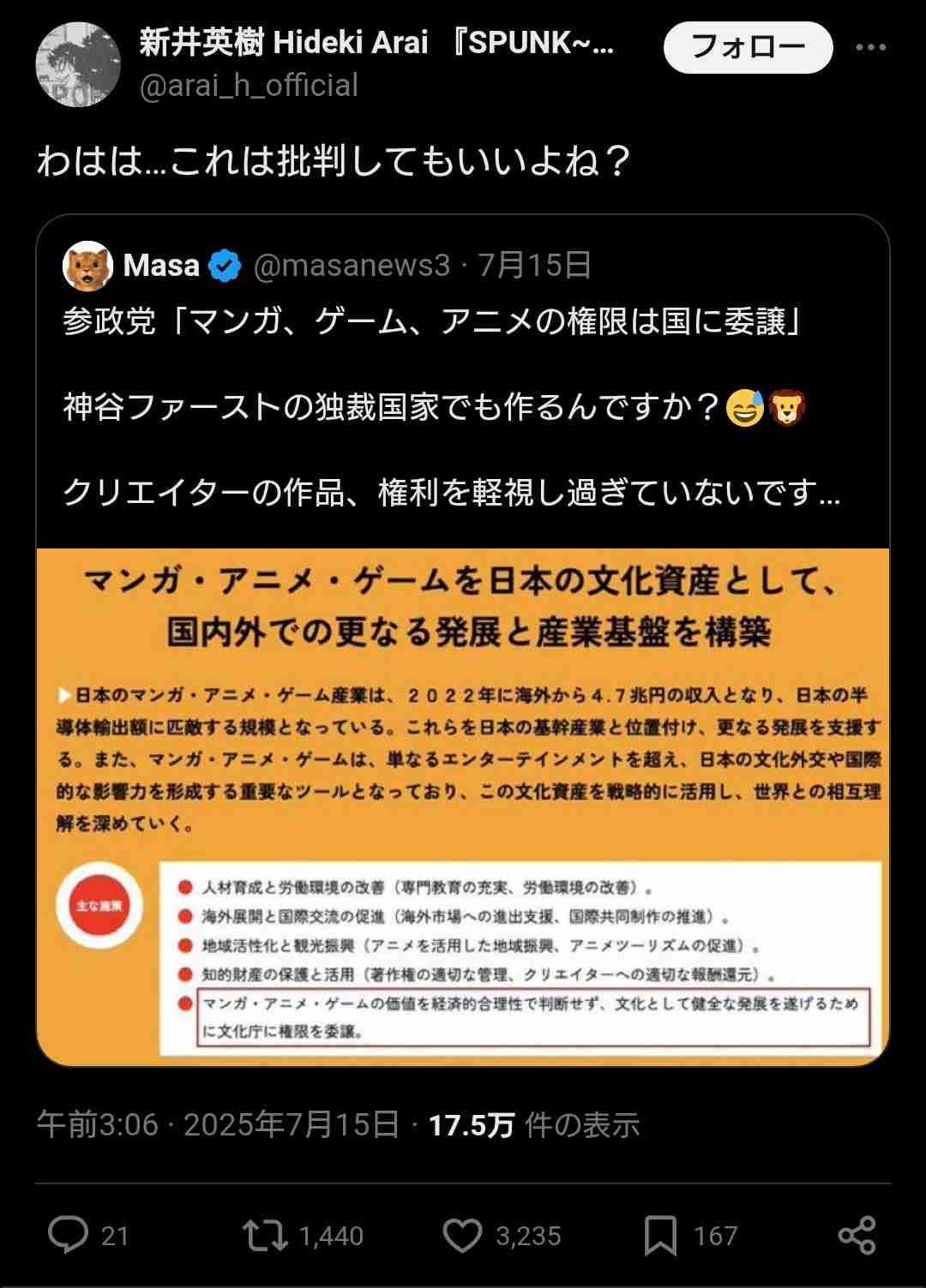 参政党「マンガ・アニメ・ゲームは国有化します😤」 →作家たちが右翼・左翼の垣根を越えて参政党批判を開始