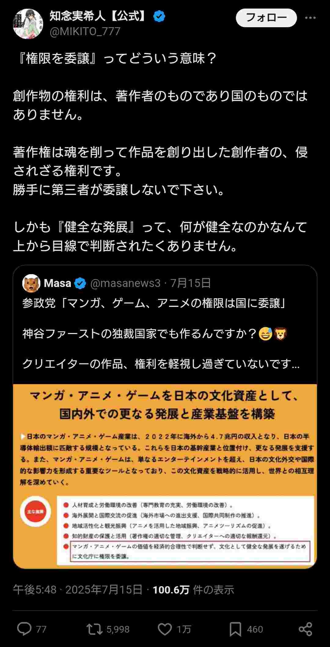 参政党「マンガ、ゲーム、アニメの権限は国に委譲」神谷ファーストの独裁国家でも作るんですか?😅🦁