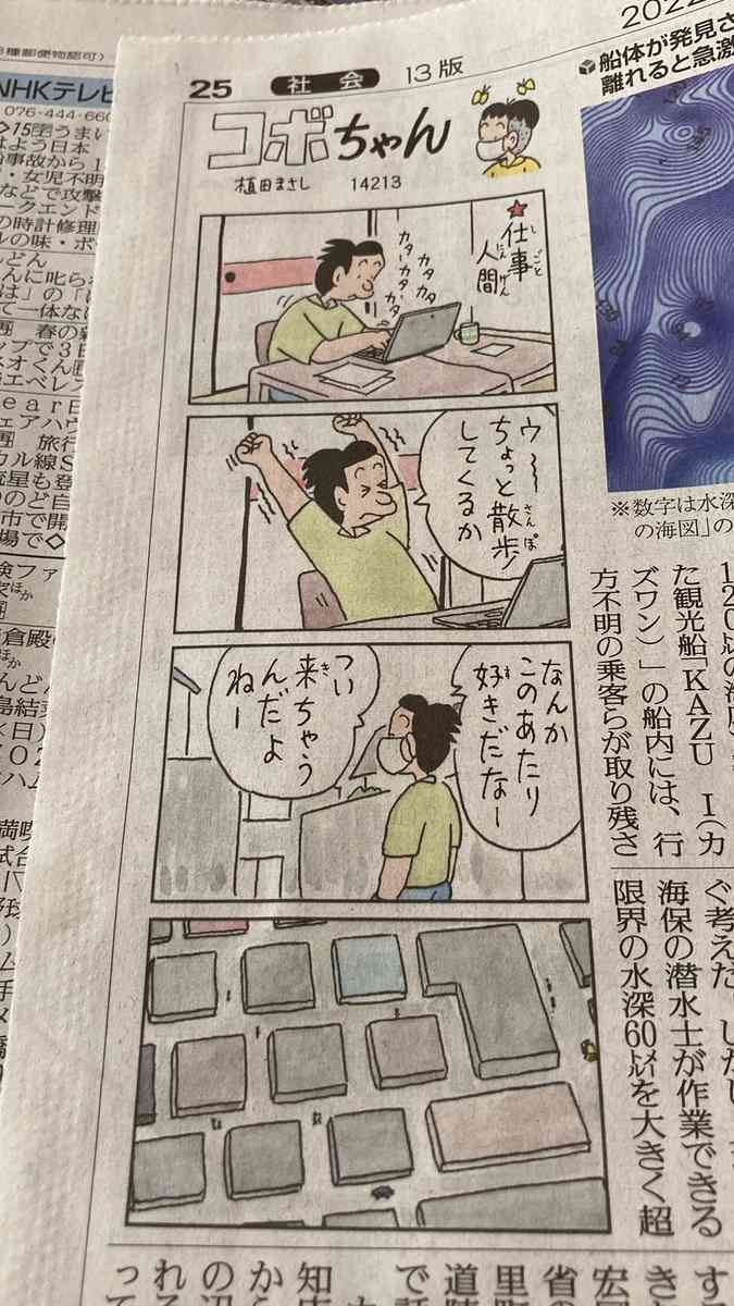- コロナ禍の影響でテレワークが増えてこの人物の様に散歩に出てる人が沢山いるみたいなこと?