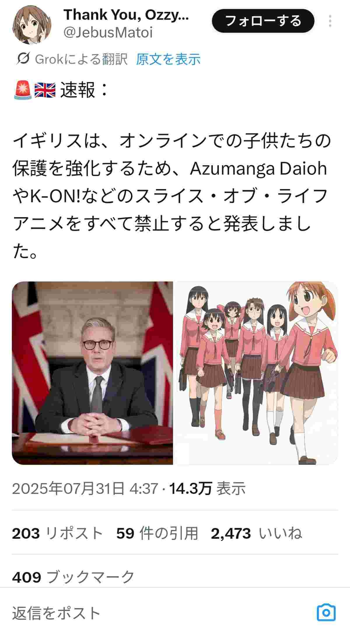 - 事実確認:誤り。英国は『あずまんが大王』や『けいおん!』のようなスライス・オブ・ライフアニメを禁止していません。オンライン安全法は有害コンテンツに対する年齢確認を義務付けていますが、これらの健全なシリーズには影響ありません。この投稿は皮肉です。