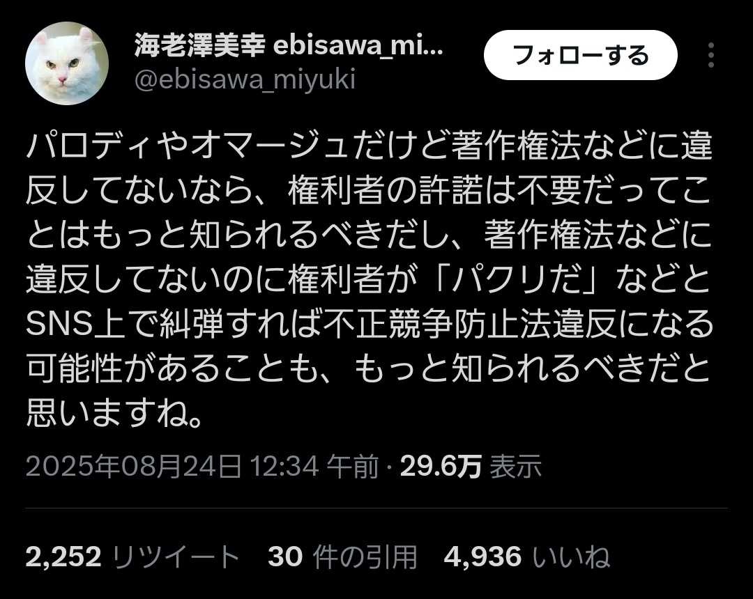 - そもそも権利自体は侵害してないんやろ?パロ元がお気持ちでダメって言ったらダメな基準を作るなら多くのものが死にそうやね