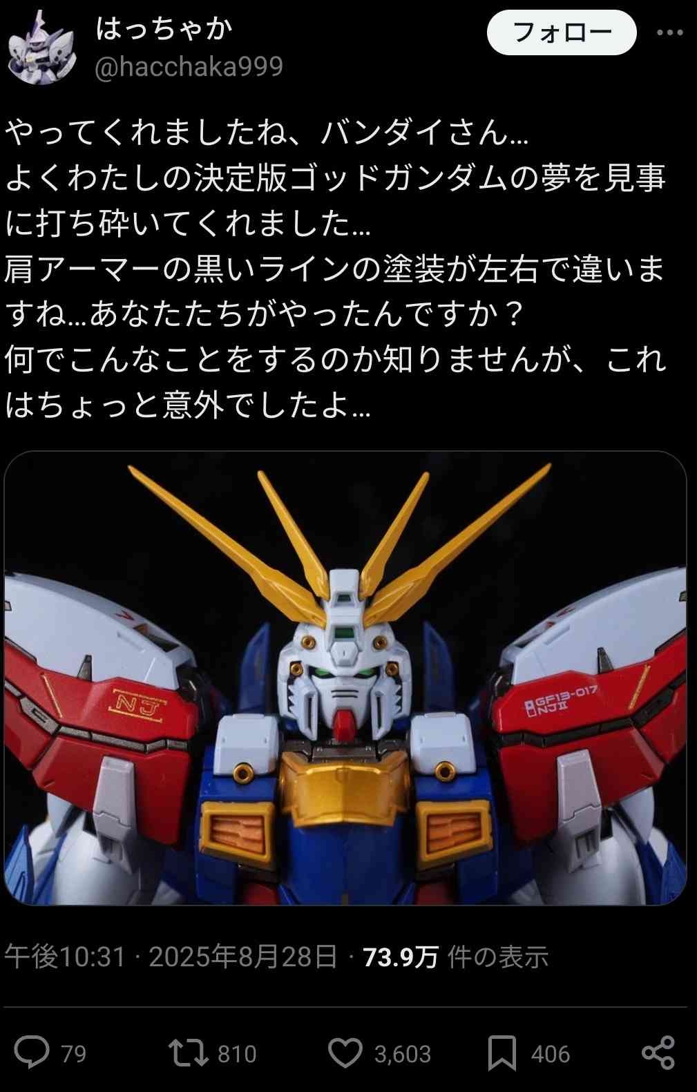 【画像】塗装ミスのGガンダム44,000円玩具、遂に公式彩色担当が反応